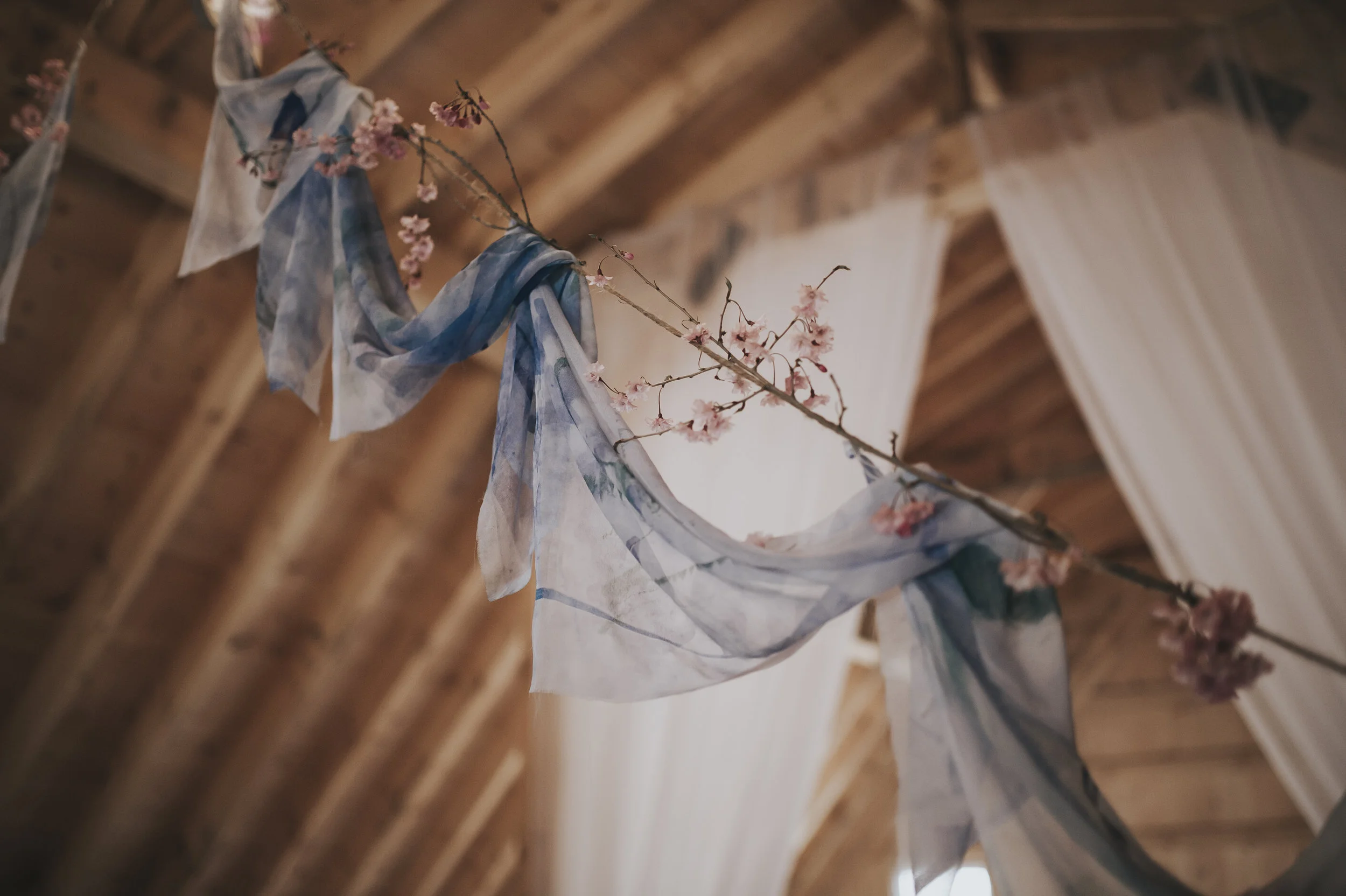 Then one day I met Chelsea Suddes from Pearl Weddings. We were working on a styled shoot for a magazine together - The Perpetual You. Chelsea has got to be one of the most genuine kind hearted people I have ever met. She was putting together a moody/ethereal styled shoot and the color of my textiles were totally on par with the color scheme. I was a little apprehensive about going because I was afraid everyone was going to love love and just be too happy. Well they did love love but, each vendor brought together was so talented in their medium. Mike Suddes helped me install the fabric and the floral designer from Pine and Petal added the perfect touch of pink cherry blossoms to finish off the display.